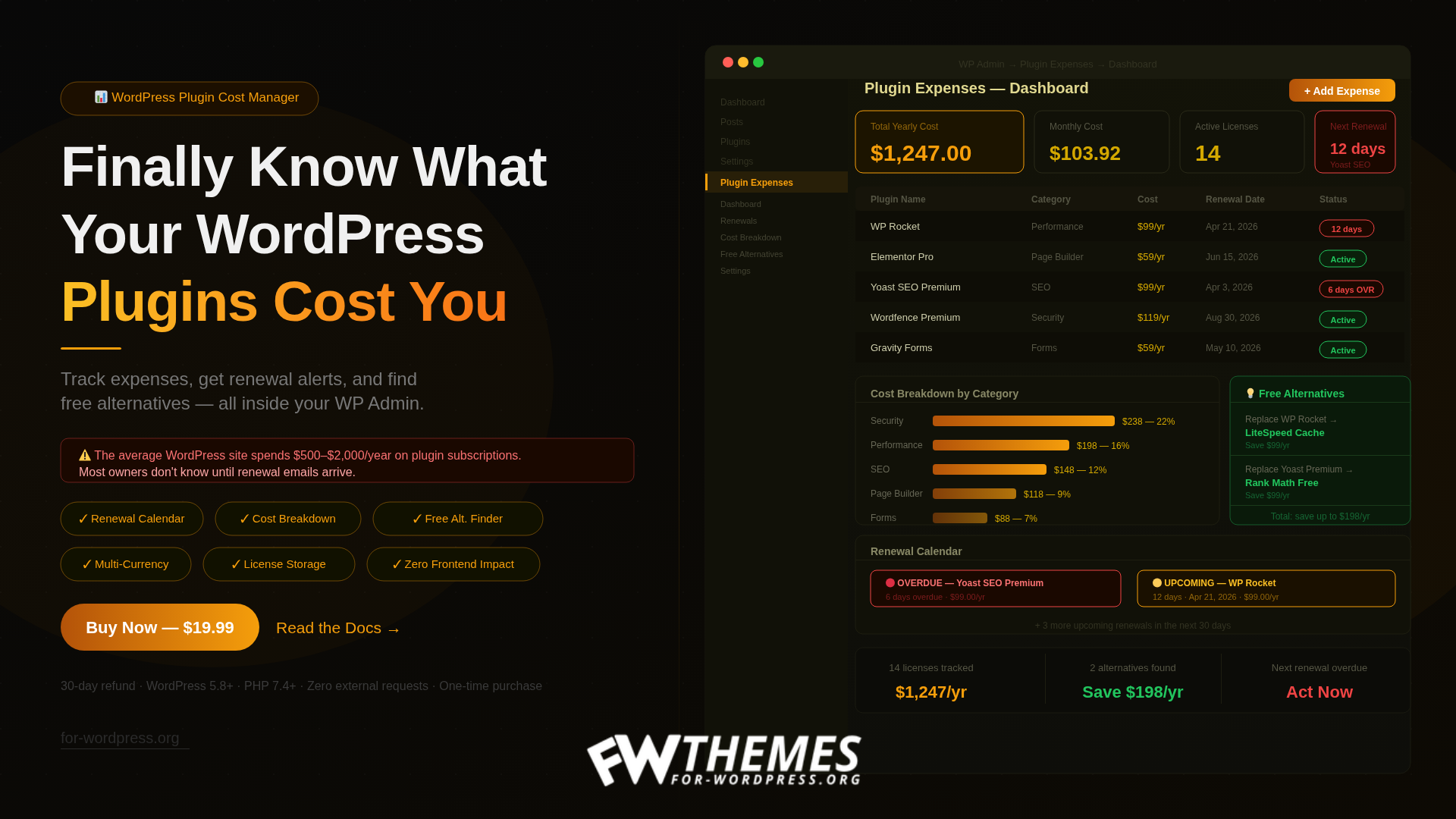 The average WordPress site running WooCommerce, a premium theme, SEO tools, security, backups, and forms spends $500–$2,000/year on plugin subscriptions — and most site owners have no idea until the renewal emails arrive. Plugin Expense Tracker puts you in control with a dedicated cost management dashboard built right into your WordPress admin.