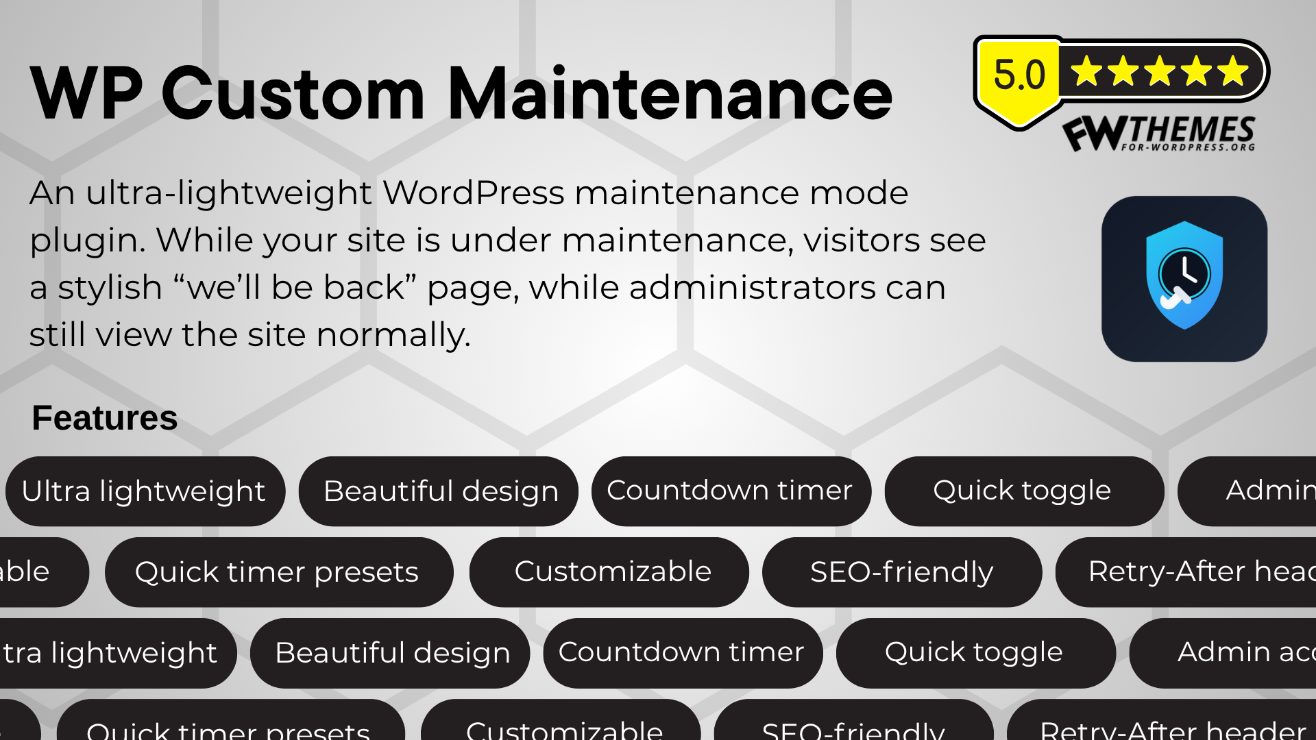An ultra-lightweight WordPress maintenance mode plugin. While your site is under maintenance, visitors see a stylish “we’ll be back” page, while administrators can still view the site normally.